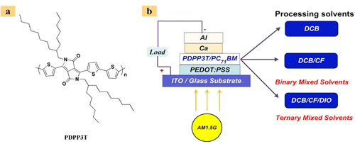 研究人員首次引入三元混合溶劑,對基于PDPP3T和PC71BM的聚合物太陽能電池 (結(jié)構(gòu)見圖1) 表面形貌、本體相區(qū)、結(jié)晶行為進行系統(tǒng)的研究,并與美國北卡羅來納州立大學(xué)(North Carolina State University)物理系的研究人員合作,運用共振軟X射線衍射、二維掠入射廣角X射線衍射等一系列手段分析了從單一溶劑到三元混合溶劑的聚合物太陽能電池活性層給受體形貌的演變過程。