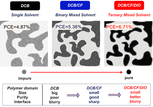 該研究是首例將三元混合溶劑引入聚合物太陽能電池制備中獲得成功的范例,揭示了溶劑體系的理性選擇對器件的性能提升有重要的影響,也為高效率材料的器件優(yōu)化提供了一個新的途徑。