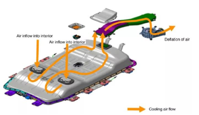 在被動(dòng)式冷卻中空氣冷卻應(yīng)用最為廣泛,所謂空氣冷卻,顧名思義就是將空氣作為傳熱介質(zhì),直接讓空氣穿過電池模塊以達(dá)到冷卻的目的。此外,空氣自然冷卻效率較低,因此電動(dòng)汽車大多使用強(qiáng)制空氣冷卻,電池的熱量經(jīng)過排風(fēng)風(fēng)扇強(qiáng)制帶走。