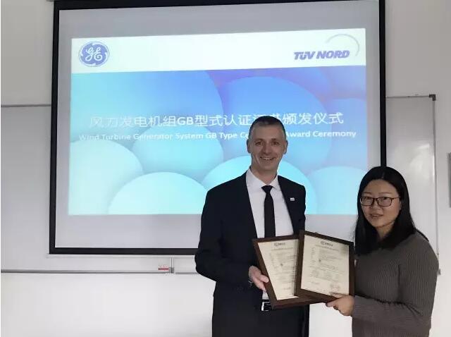 TüV北德全球新能源事業(yè)部執(zhí)行副總裁Michael Dham先生為GE頒發(fā)風(fēng)力發(fā)電機(jī)組GB型式認(rèn)證證書