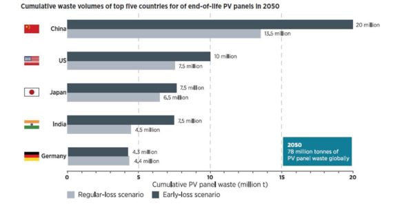 根據(jù)國(guó)際可再生能源機(jī)構(gòu)IRENA和國(guó)際能源署IEA聯(lián)合發(fā)布的報(bào)告顯示,截止2016年底,全球累計(jì)光伏廢棄產(chǎn)品將達(dá)到4.35-25萬(wàn)噸,相當(dāng)于累計(jì)安裝量的0.1-0.6%。但是到2050年,全球累計(jì)廢棄光伏材料將達(dá)到7800萬(wàn)噸,其中,中國(guó)占1350-2000萬(wàn)噸,美國(guó)占750-1000萬(wàn)噸。