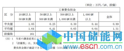 總務(wù)省在回答“認(rèn)為施工費(fèi)太高”或者“主要因?yàn)槭┕べM(fèi)太高而放棄運(yùn)轉(zhuǎn)”的798套設(shè)備中任意抽出了361套,去掉尚未開(kāi)始運(yùn)轉(zhuǎn)或者無(wú)法確認(rèn)施工費(fèi)金額的133套設(shè)備,調(diào)查了剩余的228套設(shè)備的施工費(fèi)金額。結(jié)果為,施工費(fèi)中值在(1)輸出功率在10kW以上50kW以下時(shí)為1.05萬(wàn)日元/kW;(2)輸出功率在50kW以上500kW以下時(shí)為0.25萬(wàn)日元/kW;(3)輸出功率在500kW以上1000kW以下時(shí)為0.30萬(wàn)日元/kW;(4)輸出功率在1000kW以上時(shí)為0.44萬(wàn)日元/kW,全體的中值為0.89萬(wàn)日元/kW。