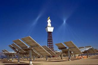 美國(guó)加州莫哈維沙漠的“艾文帕”太陽(yáng)熱能電廠就用“電塔”捕捉太陽(yáng)光線并制造蒸氣?!半娝笔窃S多巨大的柱子,周邊圍繞十七萬(wàn)片比雙人床還大的鏡子,造出的蒸氣用來發(fā)電。