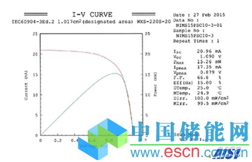 產(chǎn)業(yè)技術(shù)綜合研究所光伏發(fā)電研究中心評(píng)估及標(biāo)準(zhǔn)小組測(cè)量的鈣鈦礦太陽(yáng)能電池的電流-電壓特性(出處:日本物質(zhì)材料研究機(jī)構(gòu))