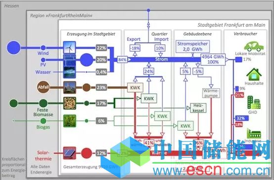 下圖為研究院給出的具體圖解,其中左邊藍(lán)色標(biāo)識(shí)代表能源來(lái)源為風(fēng)能、水力和太陽(yáng)能,棕色代表廢料發(fā)電,綠色則代表生物質(zhì)能和沼氣發(fā)電。產(chǎn)生出的電能可分別供交通、住戶(hù)和商業(yè)樓宇以及工業(yè)使用。從圖表中還可以看出,城市能源(主要是分布式光伏)足以支撐30%供電需求以及31%的供熱需求。此外,法蘭克福周邊地區(qū)如萊茵-美因地區(qū)(50%)以及黑森地區(qū)(11.6%)可再生能源也將成為法蘭克福供電的主要來(lái)源。