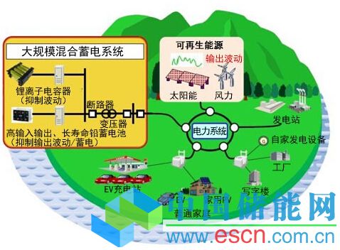 日立與新神戶電機從2011年開始,就一直在日本新能源產(chǎn)業(yè)技術(shù)綜合開發(fā)機構(gòu)(NEDO)的補助事業(yè)“安全、低成本大規(guī)模混合型蓄電系統(tǒng)技術(shù)開發(fā)”中,驗證“大規(guī)模混合蓄電系統(tǒng)”。該系統(tǒng)協(xié)同控制鉛蓄電池和鋰離子電容器。結(jié)合使用有利錯峰和削峰的“高輸入輸出、長壽命鉛蓄電池”和可有效抑制電壓和頻率的短周期波動的“鋰離子電容器”,來優(yōu)化控制電流的輸入輸出。據(jù)稱由此可緩和輸出功率波動、充分利用剩余電力并使頻率穩(wěn)定。
