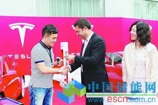 在特斯拉成都交車儀式上,特斯拉全球高級副總裁紀龍向成都車主遞交車鑰匙