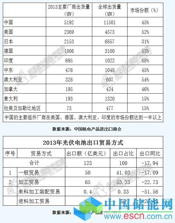 中國(guó)儲(chǔ)能網(wǎng)訊:近日,記者從中國(guó)機(jī)電產(chǎn)品進(jìn)出口商會(huì)獲悉,2013年光伏電池出口貿(mào)易主要分為一般貿(mào)易和加工貿(mào)易兩種方式,其中一般貿(mào)易出口額為123億美元,加工貿(mào)易出口額65億美元,加工貿(mào)易中的來料加工裝配貿(mào)易出口額僅為0.4億美元,進(jìn)料加工貿(mào)易則以65億美元的出口額占據(jù)絕對(duì)優(yōu)勢(shì)。