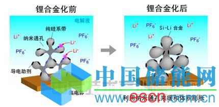 于是,研究人員開發(fā)出了通孔型多孔構(gòu)造(圖1),該構(gòu)造以硅微粒為構(gòu)造單位,使活性物質(zhì)與電解質(zhì)接觸的表面積增大,并且為了緩和伴隨鋰合金化的體積膨脹以及伴隨體積膨脹的變形,加入了適度的空間(圖1)。如果采用這種構(gòu)造,即使在伴隨大的體積變化的充放電循環(huán)中,也可始終保持電解質(zhì)與活性物質(zhì)的電氣性接觸,緩和由體積膨脹及收縮導(dǎo)致的變形。