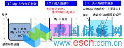 硅在與鎂制作合金時可輕松混合,同時又具有與鉍難以混合、容易相分離的性質(zhì)。日本東北大學(xué)利用這一性質(zhì),將硅與鎂構(gòu)成的合金(鎂的摩爾濃度為66.7%以上)在850℃的鉍熔融液中浸泡30分鐘,只向鉍熔融液中選擇性熔出容易混合的鎂成分,進(jìn)行去合金化處理。然后,將獲得的試樣浸入硝酸水溶液中,去除硅以外的成分(主要是鉍),再用純水清洗并烘干,制成多孔硅粉末(圖2)。獲得的硅粉末為黑色〔圖3(a)〕,從放大后的掃描電鏡圖像〔圖3(b)〕及透射電鏡圖像〔圖3(c)〕可以看出,確實(shí)形成了約100~1000nm的微細(xì)硅粒部分結(jié)合在一起的多孔質(zhì)構(gòu)造。另外,基于水銀壓入法的測試結(jié)果顯示,平均氣孔徑約為400nm,氣孔體積率約為60%,比表面積為7.6m2/g。