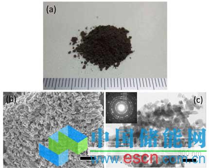 圖3:開發(fā)的多孔硅粉末。(a)外觀照片、(b)掃描型電子顯微鏡照片、(c)透射型電子顯微鏡照片和顯示硅晶體結(jié)構(gòu)的電子衍射圖。