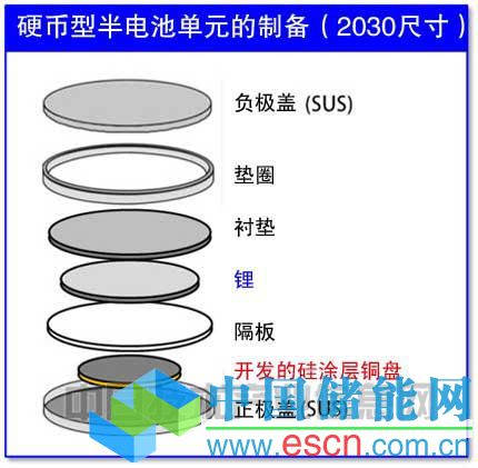 圖4:為評測負(fù)極特性而試制的半電池單元的模式圖。硬幣電池的內(nèi)部充滿電解液。