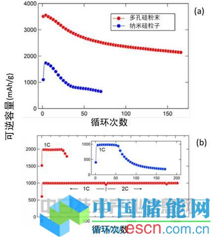 定容量充放電試驗(yàn)是在電位窗中(0~1.0V)反復(fù)充放電至2000mAh/g或1000mAh/g的定容量,充電速度設(shè)定為定電流充放電試驗(yàn)時的2倍,即1C。結(jié)果顯示,在容量設(shè)定為2000mAh/g的試驗(yàn)中,使用多孔硅粉末時性能保持在220次循環(huán),而使用硅納米粒子時則不能充電。容量設(shè)定為1000mAh/g(以往碳類材料的2.7倍)時,使用硅納米硅粒子時的性能只能保持到約50次循環(huán),而使用多孔硅粉末時,即使在721次循環(huán)后將充電速度加快至2C,性能仍可保持在1500次循環(huán)以上。此外還確認(rèn),使用多孔硅粉末時,充電速度加快至最大4C時也可充電。估計這是因?yàn)槎嗫坠璧谋缺砻娣e大。
