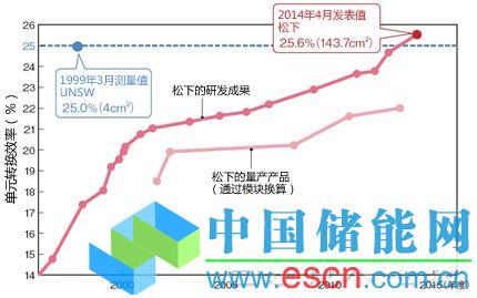 中國(guó)儲(chǔ)能網(wǎng)訊:晶體硅太陽(yáng)能電池的單元轉(zhuǎn)換效率時(shí)隔15年刷新了最高值。晶體硅是太陽(yáng)能電池目前的主流方式。此前的最高值是澳大利亞新南威爾士大學(xué)(UniversityofNewSouthWales,UNSW)于1999年創(chuàng)下的25.0%,而松下此次創(chuàng)下了25.6%的新記錄(圖1)。