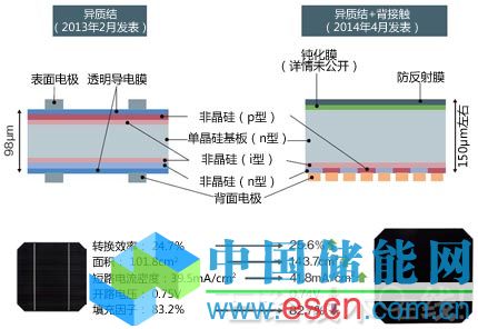 而此次松下首次采用了保留部分異質(zhì)結(jié)、去掉受光面電極的“背接觸結(jié)構(gòu)”。由于去掉了遮擋光線的電極,因此能夠增加電流量。實(shí)際上,作為電流值目標(biāo)的短路電流密度較該公司2013年2月發(fā)布的異質(zhì)結(jié)單元得到提高(圖2)注2)。在利用異質(zhì)結(jié)保持高電壓的同時(shí),通過背接觸結(jié)構(gòu)增加電流的手法為實(shí)現(xiàn)25.6%的轉(zhuǎn)換效率做出了貢獻(xiàn)。