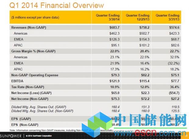 SunPower報(bào)告,2014年第一季度GAAP收入為6.924億美元,較前一季度6.381億美元有所提高。GAAP毛利率為23.5%,較2013年第四季度20.5%大幅提高。凈利潤(rùn)為6500萬(wàn)美元。