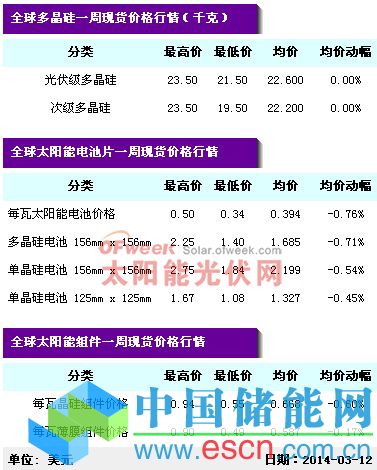 中國儲能網(wǎng)訊:據(jù)PVInsights樣本統(tǒng)計,本期多晶硅價格開始企穩(wěn)維持在上期水平,PV級多晶硅和二級多晶硅分別為22.6美元/千克和22.2美元/千克;硅片方面,本期單晶硅片價格開始回落,而多晶硅片價格依然穩(wěn)定;電池片方面,由于電池片廠商擔(dān)心在5月份之后訂單會減少,因此有些企業(yè)甚至策略性的降價以求獲得更多中國大陸外的訂單,所以本期整體電池片價格有所下降;組件方面,中國組件企業(yè)由于第一季度銷售低于預(yù)期而在降價出貨,因此本期組件整體價格仍在下跌,本期晶硅組件和薄膜組件均價已分別下跌至0.668美元/瓦和0.587美元/瓦?! ?