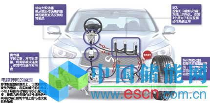 其原理如下。首先利用傳感器檢測方向盤的轉(zhuǎn)動。根據(jù)檢測結(jié)果,ECU(電子控制單元)的計算機將輪胎應(yīng)轉(zhuǎn)過的角度轉(zhuǎn)換成控制信號,通過貫穿汽車內(nèi)部的線束,也就是傳輸系統(tǒng),傳送到控制輪胎角度的馬達。因為方向盤操作是經(jīng)由電線傳遞、而不是利用傳動軸,所以叫作電控轉(zhuǎn)向。
