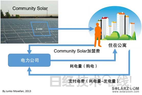 實現(xiàn)社區(qū)太陽能的關(guān)鍵在于“虛擬凈計量電價”(virtual net metering)。具體是指,使設(shè)置于某個場所(簽訂電力合同的電力公司服務(wù)區(qū)內(nèi))的太陽能發(fā)電系統(tǒng)發(fā)電量與居住于其他場所的簽約者的用電量相抵。屬于以前介紹過的凈計量電價的虛擬版。