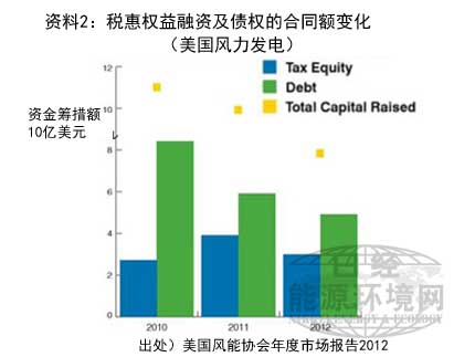 實際上,稅惠權益融資在風力融資中所占的比例正趨于下降。據(jù)美國風能協(xié)會的報告統(tǒng)計,2012年的風力發(fā)電投資額方面,稅惠權益融資為30億美元(風力開發(fā)量為393萬千瓦),債權為49億美元(427萬千瓦),直接投資為169億美元(594萬千瓦)。而2011年,稅惠權益融資為39億美元,債權為59億美元(資料2)。