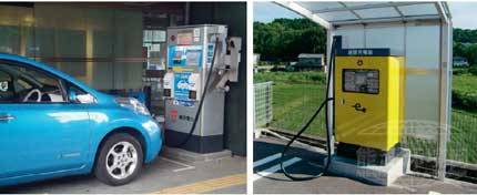 為了普及純電動汽車和插電式混合動力車,日本在加緊建設(shè)充電基礎(chǔ)設(shè)施。照片為神奈川縣政府設(shè)置的充電器(左)和CHAdeMO協(xié)議會推進普及的快速充電器(右)。