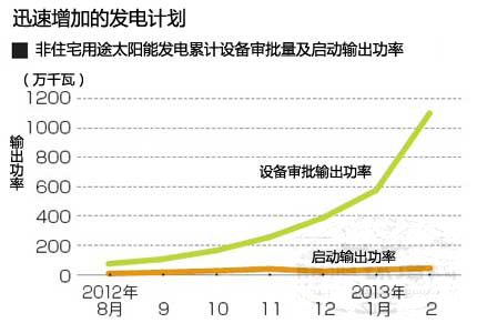 太陽(yáng)能電站建設(shè)計(jì)劃在短時(shí)間內(nèi),規(guī)模迅速擴(kuò)大。為了在可再生能源發(fā)電全量固定價(jià)格收購(gòu)制度(FIT)實(shí)施的第一年度,獲得有利的售電條件,僅2月份1個(gè)月的時(shí)間,就有526萬(wàn)千瓦的項(xiàng)目緊趕著通過(guò)了設(shè)備認(rèn)證,接近整體的一半。