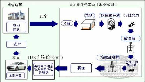 三家公司將利用日本重化學工業(yè)位于日本山形縣的小國工廠的生產(chǎn)線,從使用過的鎳氫充電電池中提取稀土。本田已于2013年3月上旬開始將回收的稀土重新用于電池,今后將利用三家公司的開發(fā)成果,在收集到一定量的電池后,重新用于馬達中。
