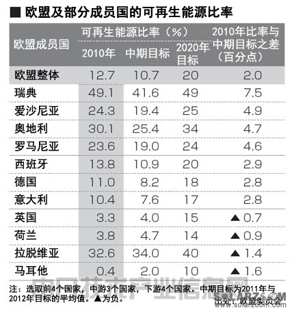 西班牙、德國及意大利等風(fēng)力和太陽能發(fā)電裝機(jī)容量居歐洲前列的國家,也在2010年,達(dá)到了比中間目標(biāo)值高近3個(gè)百分點(diǎn)的數(shù)值。