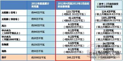 日本在2012年4月到2013年2月的可再生能源發(fā)電裝機容量。不過,在此期間還有35萬千瓦的煤炭混燃發(fā)電設(shè)備獲得審批,但因不適合將其所有發(fā)電輸出功率都作為生物質(zhì)發(fā)電,因此未計入可再生能源裝機容量(資料:經(jīng)濟產(chǎn)業(yè)?。?。