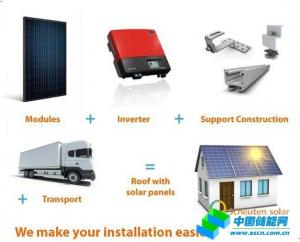 Solar Kit通過精妙的設(shè)計,可以滿足所有類型屋頂?shù)墓夥到y(tǒng)安裝。Solar Kit為客戶提供系統(tǒng)安裝所必須的所有配件:太陽能組件、逆變器、支架配件以及其他零部件。除此之外,Scheuten Solar還特別提供物流配送服務(wù)。有了Solar Kit,即可免去采購材料的一切煩惱,能夠更方便快捷地擁有一套高質(zhì)量的屋頂太陽能系統(tǒng)。