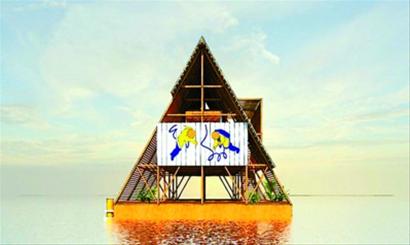 這個特別工程建在馬科科社區(qū)臟亂的水上貧民窟上,是一棟三角形的建筑物,分為三層,“地基”由塑料桶搭建,整個框架是木制結(jié)構(gòu),木材取自當(dāng)?shù)?,電力供?yīng)則由安裝在建筑物頂部的太陽能電池板支持。建成后有操場和綠地,可以接收約100名學(xué)生。