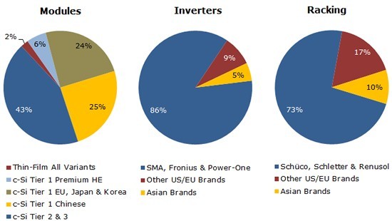 圖一、2012年底英國(guó)光伏組件、逆變器、和支架供應(yīng)格局