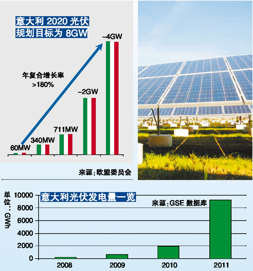 2009年,對(duì)電力需求不斷增長(zhǎng)的意大利而言是一個(gè)轉(zhuǎn)折年,由于陷入經(jīng)濟(jì)衰退,這一年意大利電力消費(fèi)需求突然下降,在此之后,需求回暖的跡象也不甚明顯。有人推斷,經(jīng)濟(jì)衰退并非導(dǎo)致電力市場(chǎng)規(guī)??s小的唯一因素,清潔電力,尤其是光伏發(fā)展也是促因之一。
