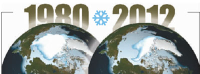 1980年,浮冰覆蓋了北極的大部分海域。多年海冰以每10年萎縮15.1%的驚人速度消失,2012年冬多年海冰再次萎縮,創(chuàng)下了第二個(gè)最低紀(jì)錄。