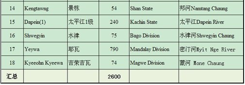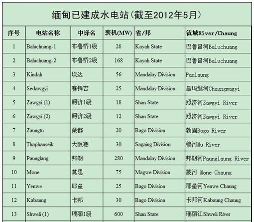 截至2012年5月,緬甸已建成水電站18個,總裝機容量2600MW,具體項目名稱如下: