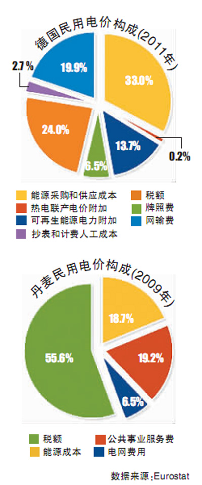 德國的銷售電價(jià)和上網(wǎng)電價(jià)近年來各自經(jīng)歷了不同的變化發(fā)展。1991-1998年,民用電價(jià)持續(xù)下調(diào)。之后,出現(xiàn)抬升,并再也沒有下降過。2010年上半年,德國民用電價(jià)約為每度0.24歐元,遠(yuǎn)遠(yuǎn)高于歐盟各成員國的平均水平。實(shí)際上這并不意味著德國發(fā)電成本高于其他國家,而是發(fā)電相關(guān)的其他稅費(fèi)太多,提高了整體價(jià)格水平。據(jù)不完全統(tǒng)計(jì),德國居民用電終端價(jià)格的40%都屬于額外費(fèi)用——從消費(fèi)稅增值稅到特許權(quán)費(fèi)用,以及可再生能源電價(jià)附加,甚至還包括在其他國家不多見的熱電聯(lián)產(chǎn)電價(jià)附加。最近幾年,德國可再生能源的發(fā)電比例不斷升高。德國經(jīng)濟(jì)研究院2011年3月份的報(bào)告顯示,使用可再生能源電價(jià)附加和相應(yīng)的增值稅已經(jīng)接近居民用電整體費(fèi)用的1/6。