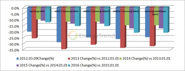 首先從補助金額下修來看,2012年3月9日的調(diào)整相較于2012年1月1日而言,下修幅度在20%至30%,其中屋頂系統(tǒng)調(diào)整幅度最大集中在10kW至10MW等中大型光伏系統(tǒng)上,而地面型光伏系統(tǒng)小于10MW的部分調(diào)整幅度約25%;除此之外,自2012年5月1日起補助金額將按月固定下調(diào)0.15歐元/kWh。