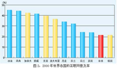 而歐洲在IT革命中的優(yōu)勢(shì)集中體現(xiàn)在應(yīng)用能力上。圖2是IT革命最興盛的2000年世界各國(guó)的互聯(lián)網(wǎng)普及率,從中可以看出冰島、瑞典等北歐國(guó)家排名靠前。