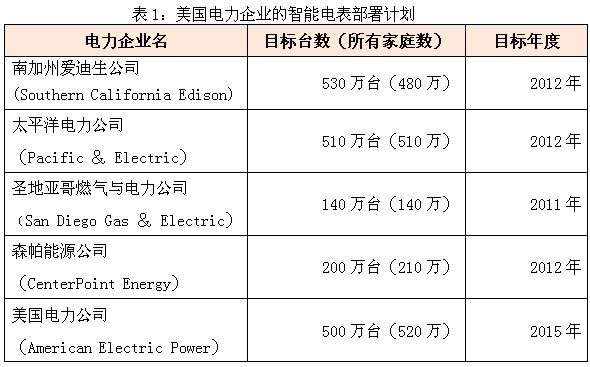 另一方面,由于對設(shè)備等硬件設(shè)施的投資大多是20年以上的長期投資,因而美國希望通過獲取需求側(cè)轉(zhuǎn)移電力峰值,來有效控制整體的投資規(guī)模。為此,美國電力企業(yè)意識到,即使自行投資進(jìn)行AMI搭建,因能夠達(dá)到電力峰值控制等效果,也可以不斷接受政府經(jīng)濟(jì)刺激計劃的補(bǔ)貼,所以它們紛紛快速部署著智能電表(表1),讓家庭用戶首先實(shí)現(xiàn)電網(wǎng)智能化。