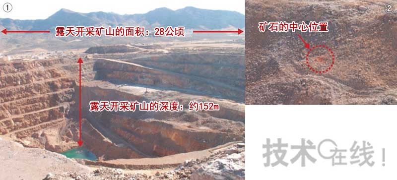 旨在挖掘含有稀土的原礦石的露天開采礦山(①)。深度為152m。②中紅色圓圈部分是為了挖掘稀土原礦石而安防炸藥的地方。