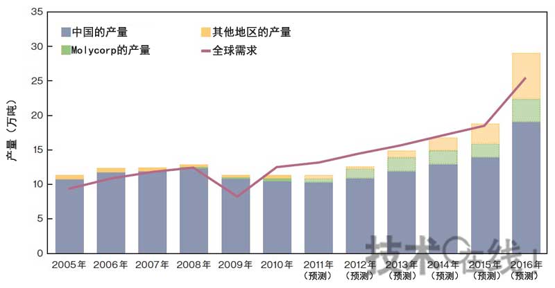 雖然中國和Molycorp的增產(chǎn)部分可以彌補(bǔ)不足,但稀土的供應(yīng)不足情況目前仍將持續(xù)。(由本雜志根據(jù)Molycorp的資料制作而成。REO(稀土氧化物)的產(chǎn)量。2015年之前的誤差范圍為±20%,2016~2020年的誤差范圍為±25%)