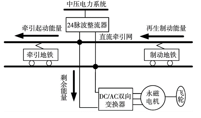 城市地鐵交通具有站間距短、載客量大、安全準點,以及車輛啟動加速快、制動減速頻繁等特點,當車輛再生制動時,將產(chǎn)生巨大的制動能量。動態(tài)能量回收系統(tǒng)可以在制動期間輔助回收動能,并將其存儲在各種儲能單元中,并在加速條件下使用。由于具有能量密度大、能量轉(zhuǎn)換效率高、工作壽命年限長、充放電時間短等優(yōu)點,飛輪儲能作為一種新型的儲能裝置,是地鐵交通能量回收的合適選擇。