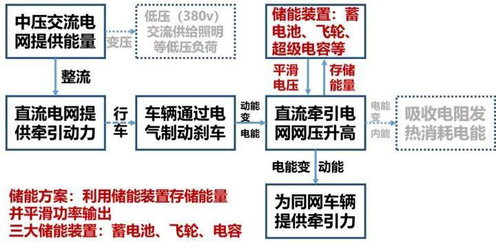 事實上,目前使用的儲能技術(shù)方案,比起單純地把站臺修高則要復(fù)雜和有效得多,為地鐵系統(tǒng)節(jié)能降耗提供了更多的調(diào)度和使用的靈活性,其能量流轉(zhuǎn)過程如下圖所示,儲能的代表技術(shù)主要有蓄電池儲能、電容儲能、飛輪儲能3種。