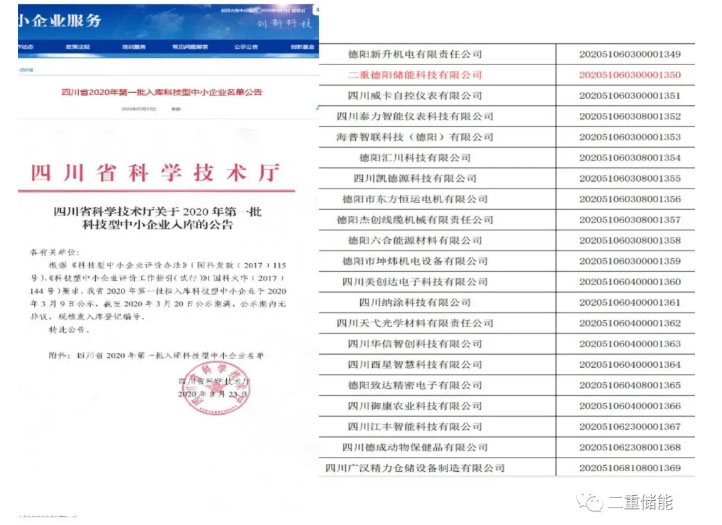 中國(guó)儲(chǔ)能網(wǎng)訊:近日,二重德陽(yáng)儲(chǔ)能有限公司(簡(jiǎn)稱“二重儲(chǔ)能”)順利通過2020年四川省第一批國(guó)家科技型中小企業(yè)認(rèn)定。