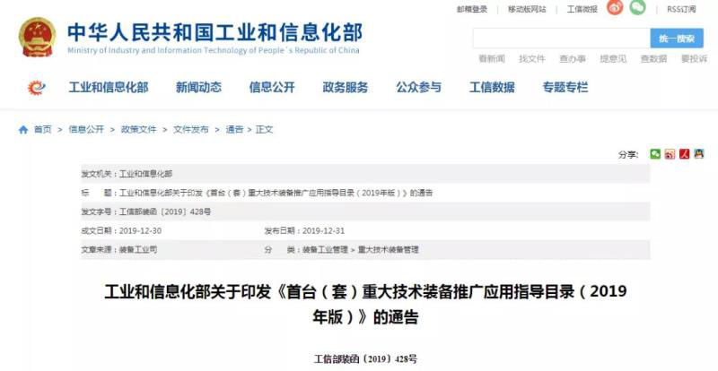 工業(yè)和信息化部關(guān)于印發(fā)《首臺(套)重大技術(shù)裝備推廣應(yīng)用指導(dǎo)目錄(2019年版)》的通告