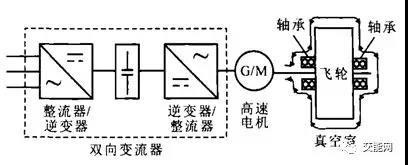 飛輪儲(chǔ)能裝置軸承的設(shè)計(jì)一般都使用非接觸式的磁懸浮軸承技術(shù),主要為了減少空閑運(yùn)轉(zhuǎn)時(shí)的損耗,提高飛輪的轉(zhuǎn)速以及飛輪儲(chǔ)能裝置的效率。同時(shí)電機(jī)和飛輪都被密封在一個(gè)真空容器內(nèi)以降低運(yùn)行時(shí)的空氣阻力。為了降低成本,也為了讓系統(tǒng)更加一體化,發(fā)電機(jī)和電動(dòng)機(jī)通常公用一臺(tái),通過(guò)軸承直接和飛輪連接在一起。由于飛輪的能量和轉(zhuǎn)速有關(guān),充放過(guò)程中也伴隨著變速,所以飛輪和電網(wǎng)之間還必須通過(guò)變流器來(lái)連接。