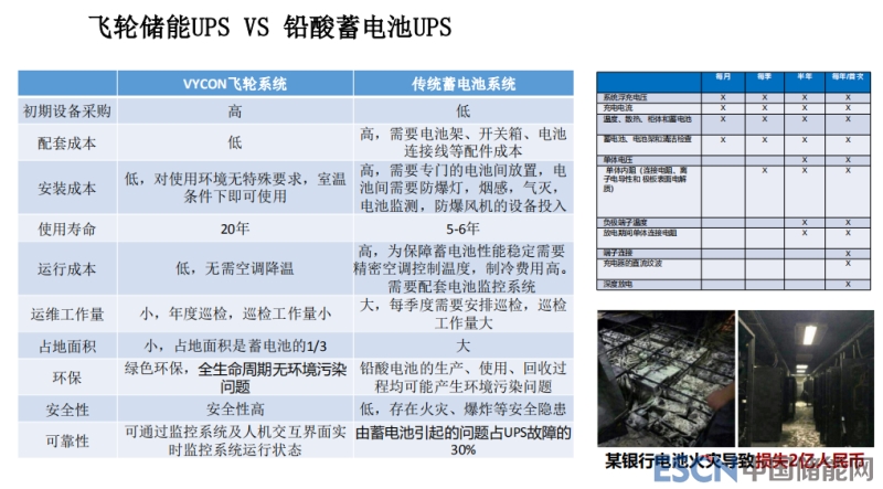 飛輪儲能和鉛酸電池,這是在一個UPS領(lǐng)域,比如說我們在一些區(qū)域中心,大家認(rèn)為鉛酸電池非常安全,其實不是這樣的,也會有事故,雖然比較少。比如說這個銀行做的UPS電源出現(xiàn)事故之后,導(dǎo)致經(jīng)濟(jì)損失2億人民幣,我們傳統(tǒng)的概念來說,我們都覺得鉛酸將近兩百年,實際情況是,根據(jù)統(tǒng)計學(xué)的方面得出結(jié)論,用飛輪儲能做UPS其實更好,目前很多醫(yī)院、機(jī)場,包括應(yīng)急電源都把飛輪儲能做UPS,國外大概有幾千套的應(yīng)用。