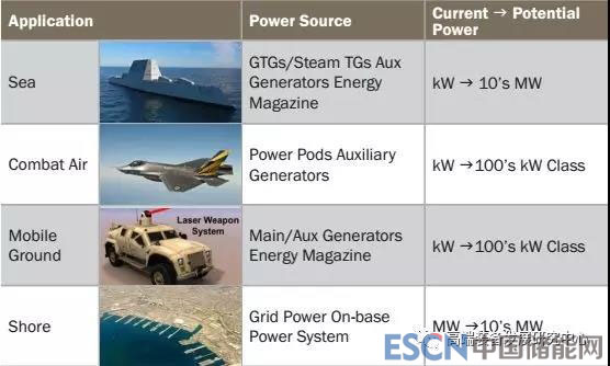 當前的海上平臺具有使用不同類型的發(fā)電機產(chǎn)生電力的能力??罩泻偷孛嫫脚_依賴于電源艙和輔助發(fā)電機,而岸基系統(tǒng)依賴于電網(wǎng)或基礎電力系統(tǒng)。下表顯示了不同應用場景DEW的電源設備,以及目前能實現(xiàn)功率和未來需求功率。