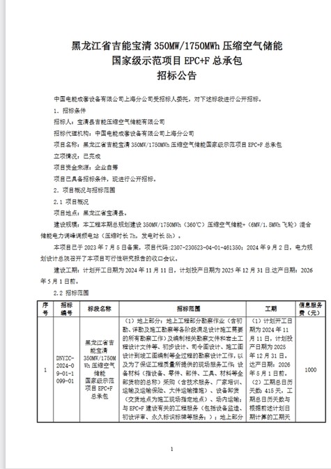 中國(guó)儲(chǔ)能網(wǎng)訊:9月30日,寶清縣吉能壓縮空氣儲(chǔ)能有限公司發(fā)布黑龍江省吉能寶清350MW/1750MWh壓縮空氣儲(chǔ)能?chē)?guó)家級(jí)示范項(xiàng)目EPC+F總承包招標(biāo)公告。