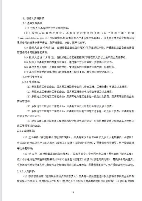 要求投標(biāo)人近5年內(nèi),應(yīng)具有至少2臺(tái)350MW級(jí)及以上火電勘察設(shè)計(jì)業(yè)績(jī)和2臺(tái)350MW級(jí)及以上火電EPC總承包(或施工)業(yè)績(jī)。近10年,應(yīng)具有至少1個(gè)水利水電工程(需包含地下隧洞工程)或1個(gè)水電站地下硐室群的勘察設(shè)計(jì)和EPC總承包(或施工)業(yè)績(jī)。